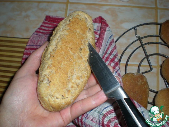 Затем острым ножом вырезать середину. Вырезайте со стороны "донышка", т. е. низ булочки.