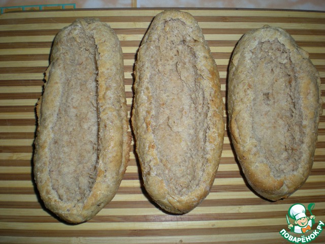 Вырезайте аккуратно, чтобы не прорезать лодочки. Не спрашивайте куда девать хлебный мякиш. Можно нарезать кусочками и подсушить гренки для овощного салата. Я не успела))) Булочки получаются такие вкусные, что даже мякиш мои домашние съели просто так.