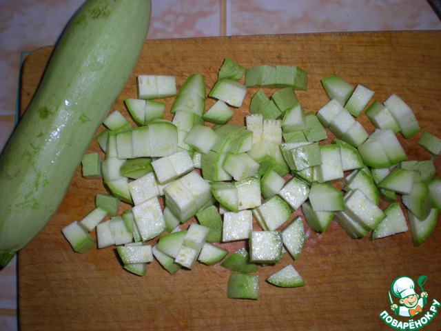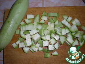 Небольшой кабачок нарезать мелкими кубиками и жарить минут 10 в небольшом количестве растительного масла. Я взяла 2ст. л. оливкового масла из вяленых помидор. К кабачкам можно добавить баклажаны или болгарский перец. В общем, подойдут сезонные овощи.