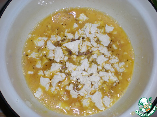 Яйца слегка взбить. Отобрать 3 ст. л. яйца в другую посуду для смазывания лодочек. Добавить соль, перец и творог. Хорошо смешать ложкой или пробить блендером