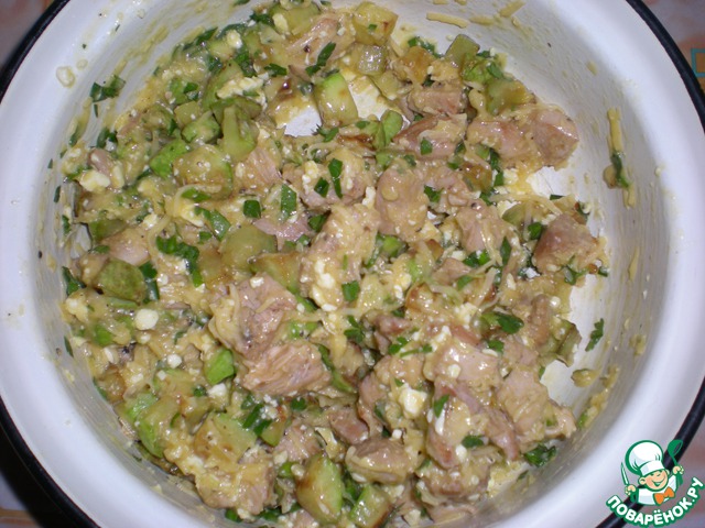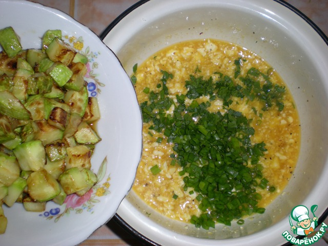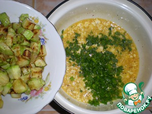 К яичной массе добавить нарезанную зелень петрушки и зеленого лука и остывший кабачок.