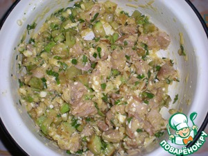 Добавить мясо и натертый на мелкой терке твердый сыр. Все перемешать.