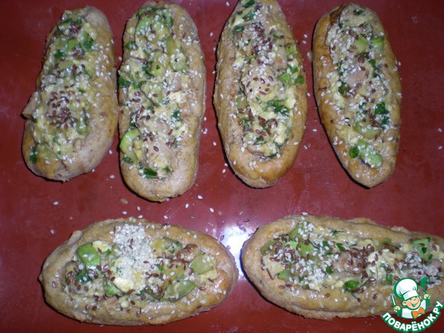 Смазать бока и верх лодочек взбитым яйцом. Посыпать кунжутом. Я еще посыпала и льняным семенем. Поставить лодочки в духовку при 180* на 20 минут.