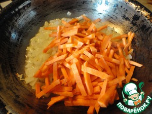 Потом добавляем морковь и пассеруем вместе.