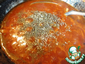 Добавляем в соус свежемолотый черный перец, сухой базилик и орегано.