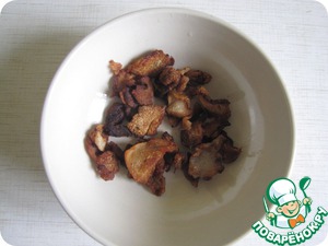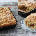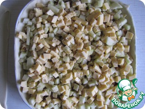 Выложить начинку слоями в следующем порядке: картофель, лук, бекон, яблоки с грушами. И последним слоем нарезанный кубиками сыр. Начинку приправить свежемолотым перцем.