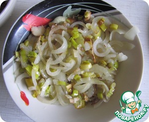 Порей и репчатый лук измельчить и обжарить на жире от бекона до мягкости 5-7 минут.