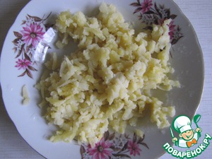 Картофель отварить в мундире, остудить, очистить и натереть на крупной терке.