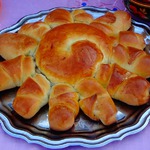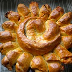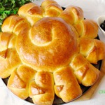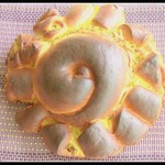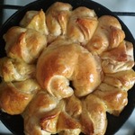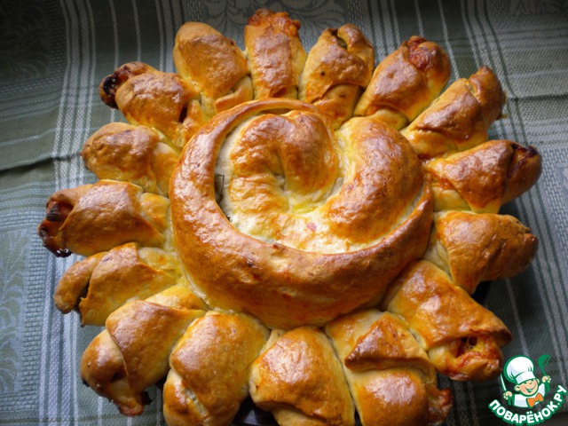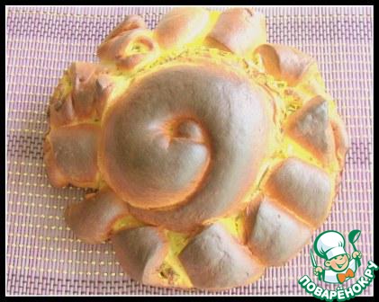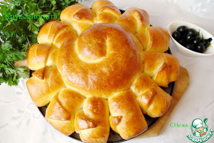 • В форму диаметром 26 см (я застелила бумагой), выкладываем в центр нашу улиточку, а круасанчики - как лучики у солнца.