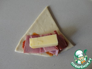 Начинка №2: смазываем треугольничек томатной пастой, кладем кусочки ветчины и сыр. Сворачиваем круасанчик.