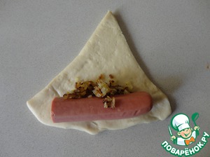 Начинка №3: половинка сосиски и обжаренный лук. Сворачиваем по такому же принципу.