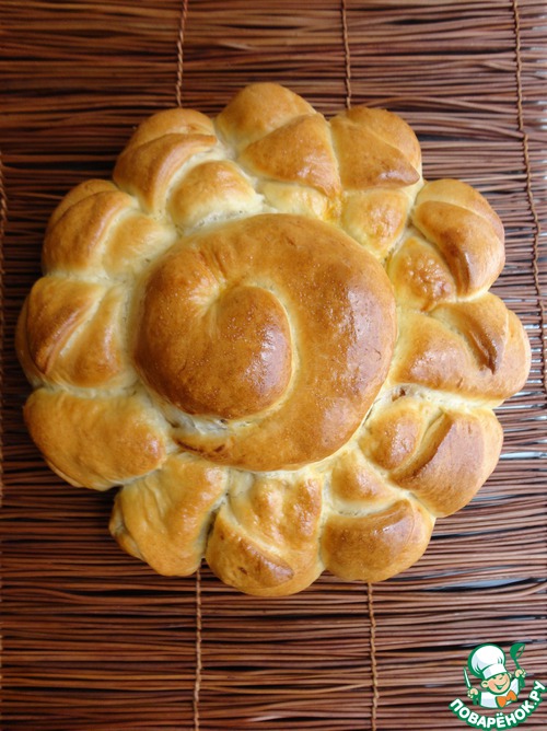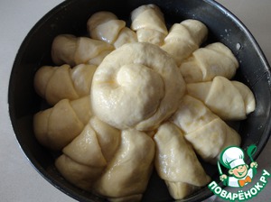 В форму диаметром 26 см (я застелила бумагой), выкладываем в центр нашу улиточку, а круасанчики - как лучики у солнца.