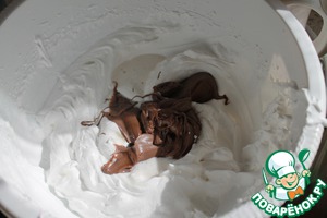 Отделить 1/3 сливок в другую емкость. В 2/3 сливок добавить 4 ст. л. шоколадной пасты и влить 2/3 разогретого желатина. Вбить миксером до однородности.
