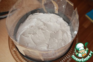 Увеличить бортики разъемной формы (у меня 23 см в диаметре). Я увеличила плотной, пластиковой пленкой с коробки от детской машины. На дно положить корж, пропитать карамельным сиропом.