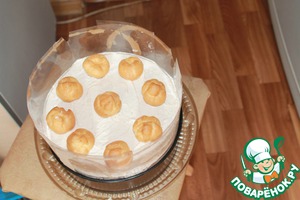 По верх третьего коржа выложить оставшиеся сливки со вкусом карамели. Хорошо разровнять и украсить профитролями. Поставить торт в холодильник для застывания. Затем снять бортики.