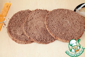 Заранее испечь шоколадный бисквит. Остудить. Разрезать на 3 коржа.