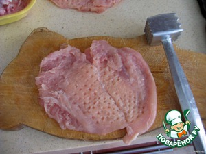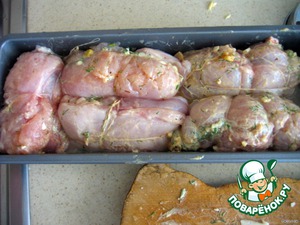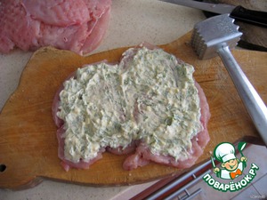 4. отбитый кусочек курочки посолить, поперчить, намазать майонезной смесью