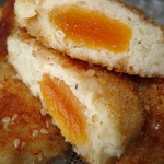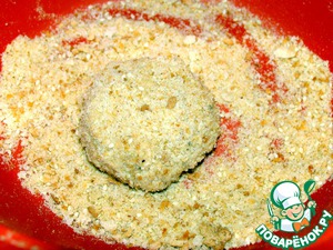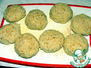 Из фарша скатать 8 шариков. В каждый внутрь положить по одной кураге. Приготовить панировку из сухарей и кунжута.