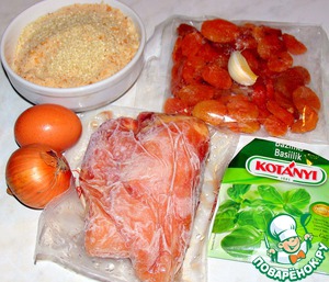Ингредиенты для котлет. В комбайн положить нарезанное небольшими кусочками куриное филе, лук, чеснок, яйцо, соль, перец, сушенный базилик, налить куриный бульон и немного измельчить.