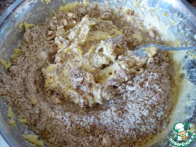 Введите в тесо молотый миндаль, сок и цедру лимона. Аккуратно перемешайте большой металической ложкой, стараясь не слишком осадить тесто.