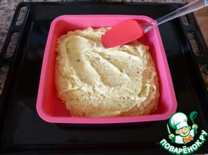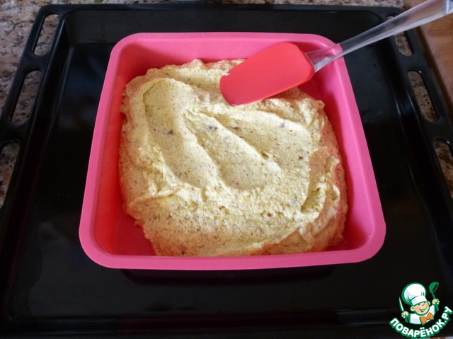 Поставьте форму на противень. Переложите в форму тесто и разровняйте лопаткой.