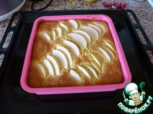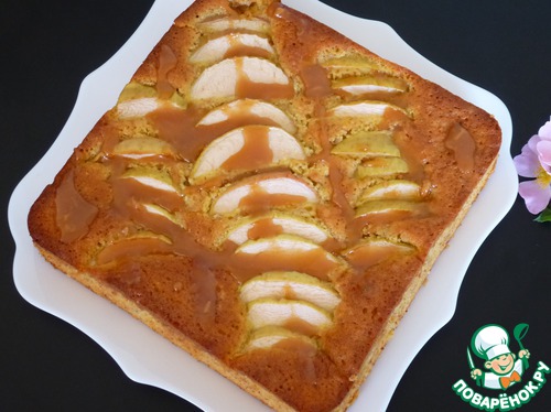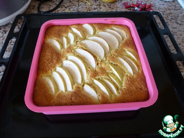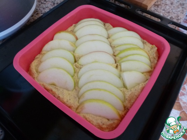 Разрежьте яблоки на четыре части, удалите семенные коробочки. Разрежьте каждую часть на несколько долек. Выложите яблоки на тесто. Выпекайте в центре духовки 30-40 минут. если верх пирога слишком подрумянится, то его можно не плотно накрыть фольгой.