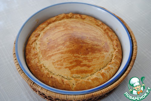 Раскатываем вторую часть теста. Накрываем ею пирог, края скрепляем. Вилкой делаем проколы. Смазываем яйцом. И отправляем в духовку на 50-60 мин. при 180*С.