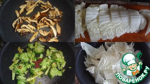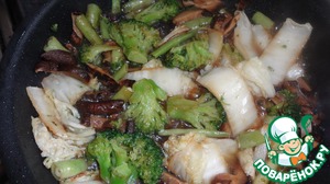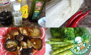Пекинскую капусту порежем крупно и немного обжарим на раст. масле. Отложим в сторону, в этом же масле обжарим размокшие и порезанные грибы шиитаке. Отложим их к капусте. Последними обжарим с двух сторон фасоль и брокколи.