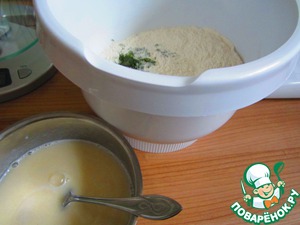 • Замешивание теста я не фотографировала, поэтому опишу вкратце. В муку вливаем теплое молоко, половину чайной ложки сахара и 1 чайную ложку соли без горки и 2 столовые ложки растительного масла. Добавляем зелень по вкусу, как свежую так и сухую.