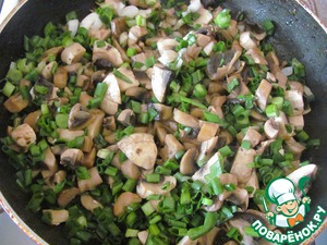 Для тех, кто будет специально готовить такое блюдо, сначала нужно поставить варить картофель на пюре. А т. к. у нас оно уже готовое, мы сначала приготовим начинку. Грибы нарежем некрупными кусочками и обжарим с луком, порезанным средним кубиком, на растительном масле до готовности.