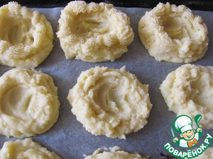 На пергаментную бумагу кондитерским шприцом выдавливаем гнёздышки из картофельного пюре.