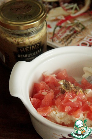 Приготовим начинку. Для нее соединим сливочный сыр, нарезанную кубиками форель и горчицу.