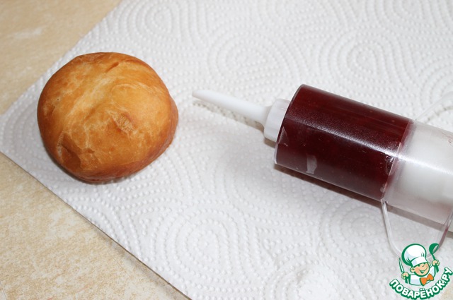 Готoвые пончики кладем сразу на бумажные полотенца. Подготовим конфитюр, разогреем его в микроволновке. Я взяла шприц для тортов. Наливаем в него наш жидкий джем и сбоку делаем прокол. Понемногу наполним джемом. Выкладываем и обсыпаем сверху сах. пудрой.