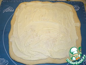 Выложить начинку на раскатанное тесто, распределить равномерно, не доходя немного до краев.