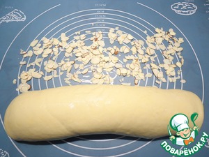 На стол насыпать миндальные лепестки, обвалять в них поверхность, смазанную яйцом.