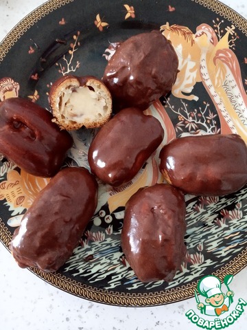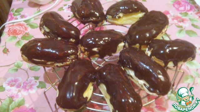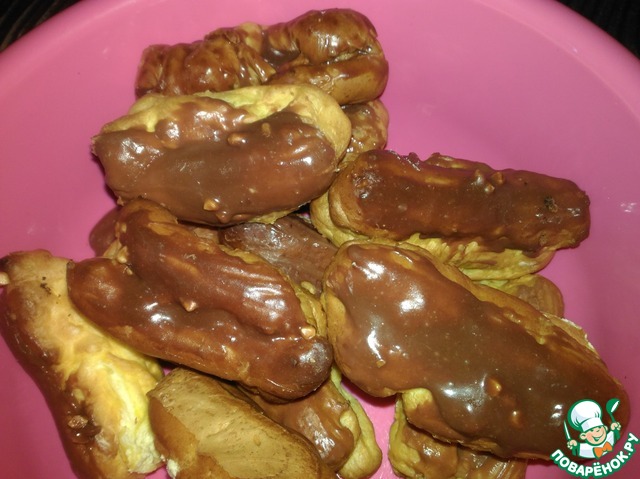 В рецепте я указала вес эклеров без начинки. Это необходимо для пропорции. А вот наносить глазурь мы будем на пирожные с кремом.