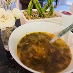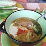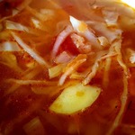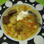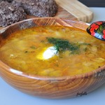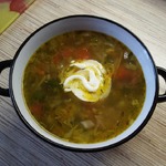 Потом добавить в суп морковь с луком, мясо, специи и приправу. Варить 3 минуты.