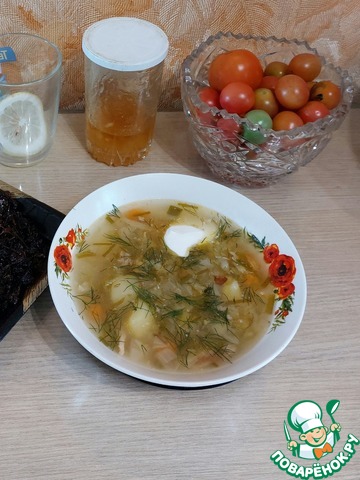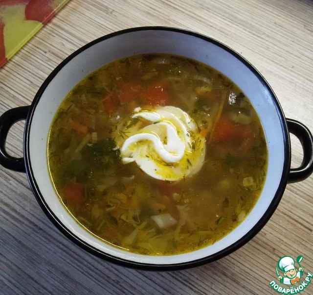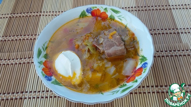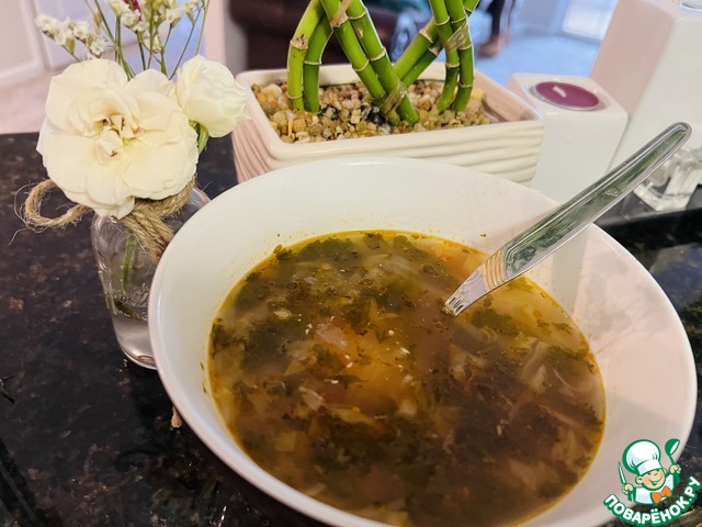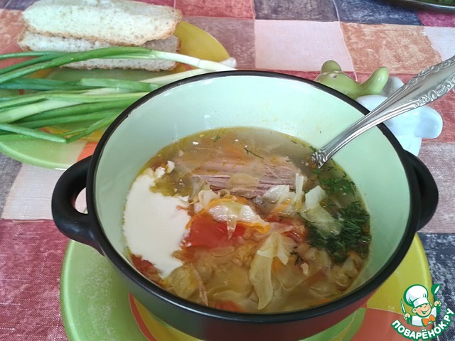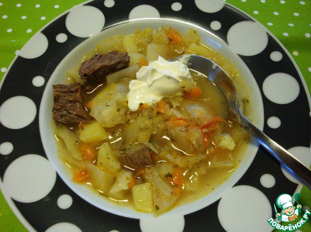Когда щи будут готовы, положить в них рубленую зелень и чеснок с солью. Перемешать. Если мало соли - досолить по вкусу. -