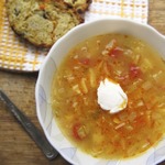Капусту и очищенный картофель нарезать кубиками. Помидор ошпарить кипятком, облить холодной водой и очистить от шкурки. Нарезать его тоже кубиками, но помельче. Лук очистить и мелко нарезать. Морковь натереть на крупной терке. Растопить на сковороде сливочное масло и обжарить в нем лук и морковь.