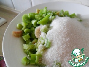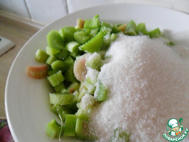 Нарежьте ревень кусочками и пересыпьте его сахаром. Оставьте давать сок.