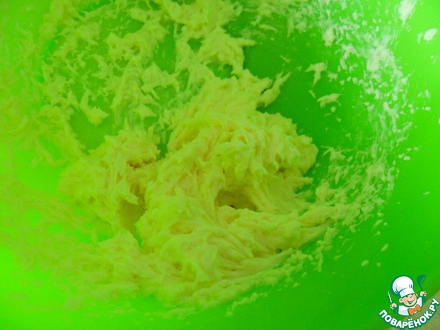 В миске разотрите масло (комнатной температуры) с сахаром и ванильным сахаром.