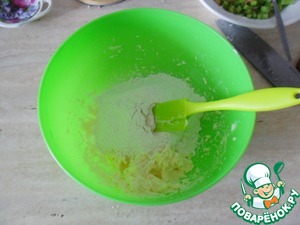 Всыпьте смесь муки с разрыхлителем и замесите тесто.