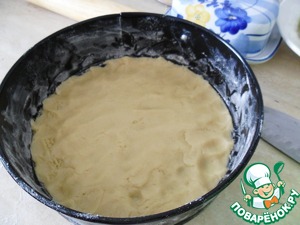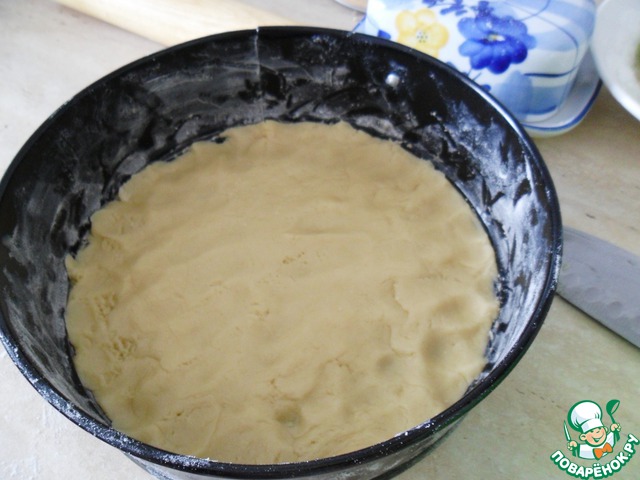 Подготовьте форму - смажьте ее маслом и присыпьте мукой. Переложите в нее слегка раскатанное тесто (поможет переложить скалка) и