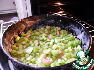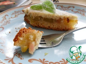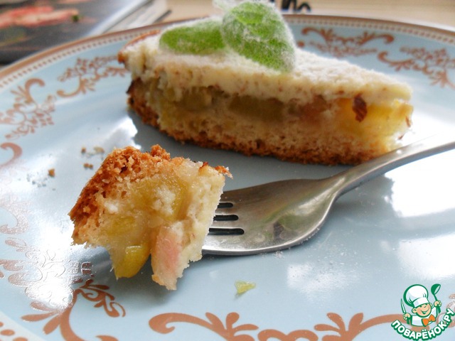 Сверху на тесто выложите ревень и полейте все соком. Поставьте в духовку 180-190 градусов на 35 минут.