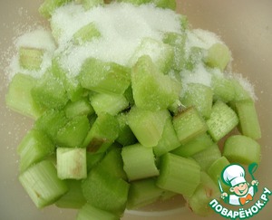 Итак, ревень очистить, нарезать и смешать с сахаром (80 гр).