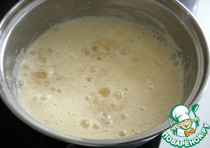 Сливки разогреть в сотейнике (не кипятить), желтки слегка взбить с сахаром (20 гр) и с ванильным сахаром (10 гр, можно заменить обычным). Тонкой струйкой влить горячие сливки, быстро перемешать и опять поставить на огонь. -