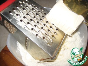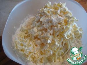 Включила на максимум (у меня 250град. Ц)духовку. Муку перемешиваем с сахаром, ванильным сахаром и разрыхлителем. Холодный (не замороженный) маргарин натираем на крупной терке в муку.