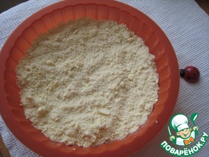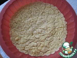Высыпаем эту крошку в форму. Вот здесь-ВНИМАНИЕ!!! Если Вы собираетесь подавать чизкейк в форме, то здесь вам подойдет силиконовая форма, как у меня, например. Если же Вы собираетесь чизкейк подавать на красивом блюде, то желательно печь чизкейк в разъемной форме, либо проложить форму пергаментной бумагой с высокими краями, чтобы за них затем вынуть пирог из формы. Я не сделала ни того, ни другого и мне затем пришлось попотеть, чтобы красиво вынуть пирог. Ставим тесто в горячую духовку на 10-15 минут.