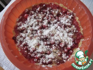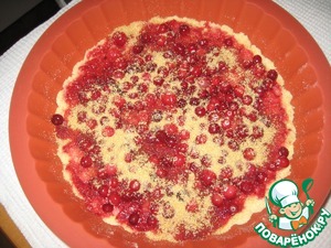 Часть клюквы можно раздавить с 4 ст. л. сахара и положить на корж. Сверху - целые ягоды. Все это присыпать тростниковым коричневым сахаром.
