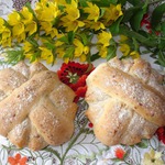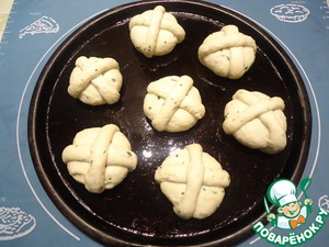 Из большей части теста формую шар, а из меньшей скатываю два небольших жгутика, которыми накрываю шар накрест. Жгутики должны немного заходить под низ шара.